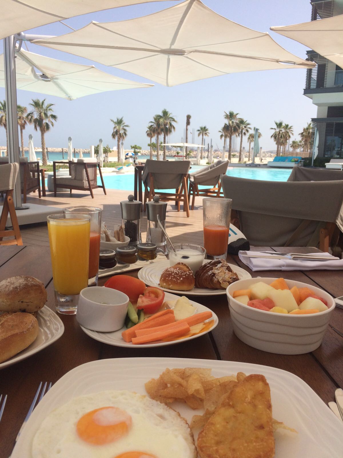 Back in Dubai, we decided to finish our trip in style with a stay at Nikki Beach Resort & Spa Dubai. We booked the Covet Room, which featured a king-size bed, a spacious bathroom with a walk-in shower and bathtub, and a stunning view of the glittering Dubai skyline. The service was truly five-star too and the resort had everything we could ask for: a relaxing spa, multiple pool areas, a private beach with cozy cabanas, exclusive access to the vibrant Nikki Beach Club, and several excellent restaurants and cafés. Thus, especially mornings were a treat with their extensive breakfast buffet and à la carte dishes, all served poolside too.
